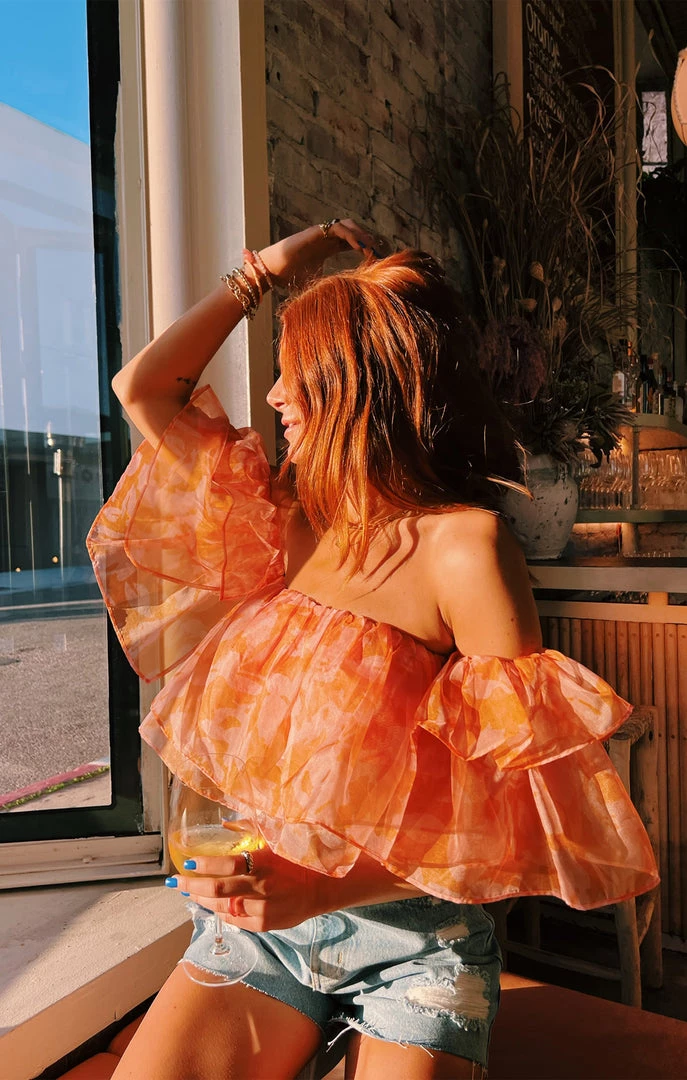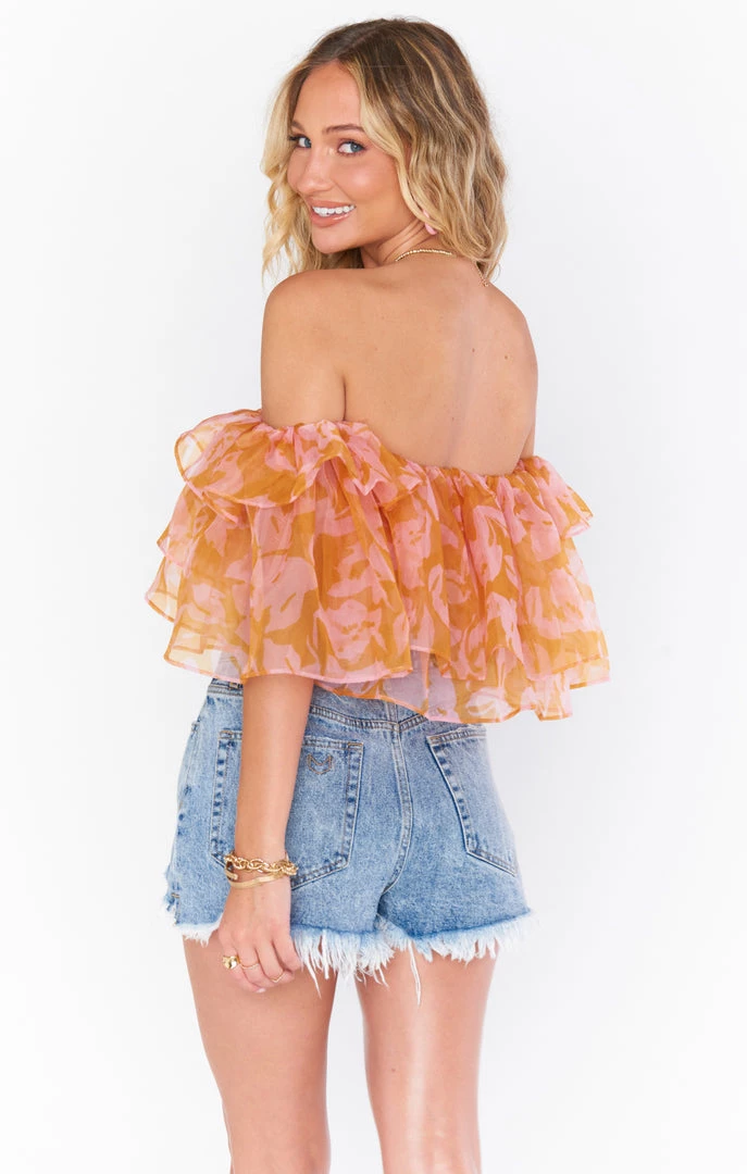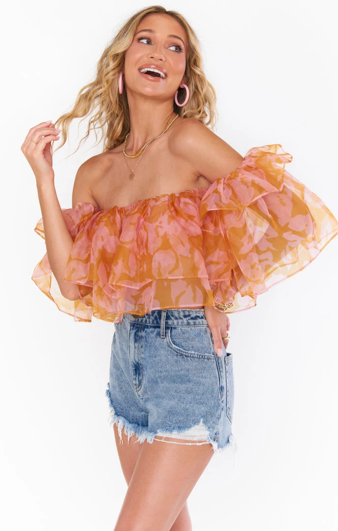 Angel in organza wearing this off the shoulder pink and orange floral top! Ruffled to perfection with elastic around the neckline to keep it in place, this feminine floral crop top will bring every outfit to the next level.