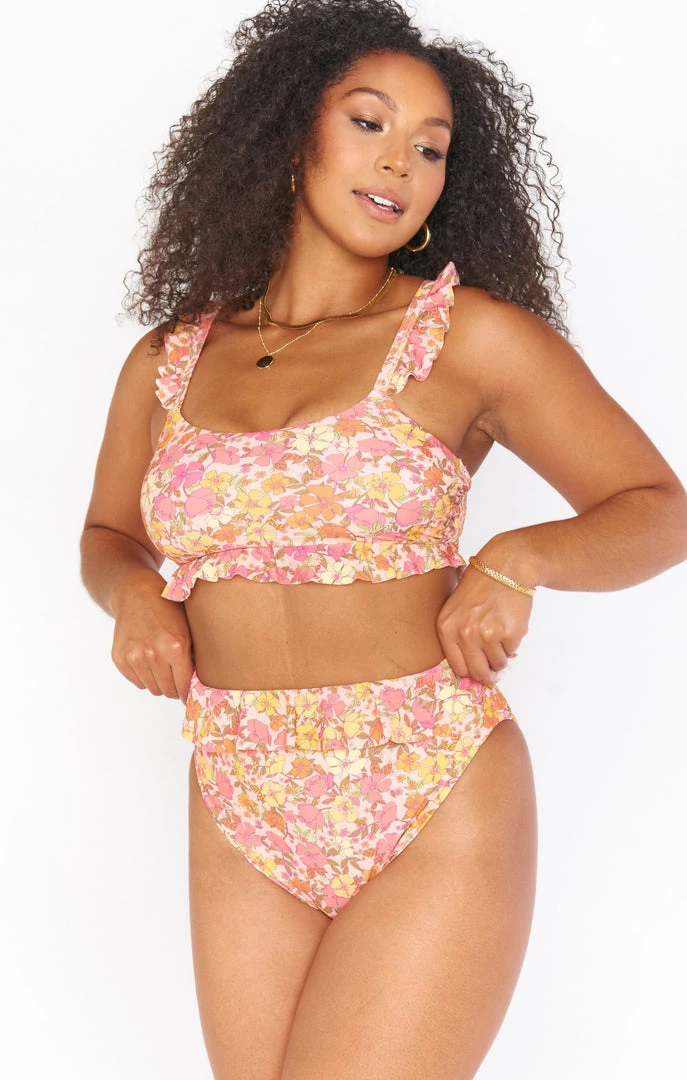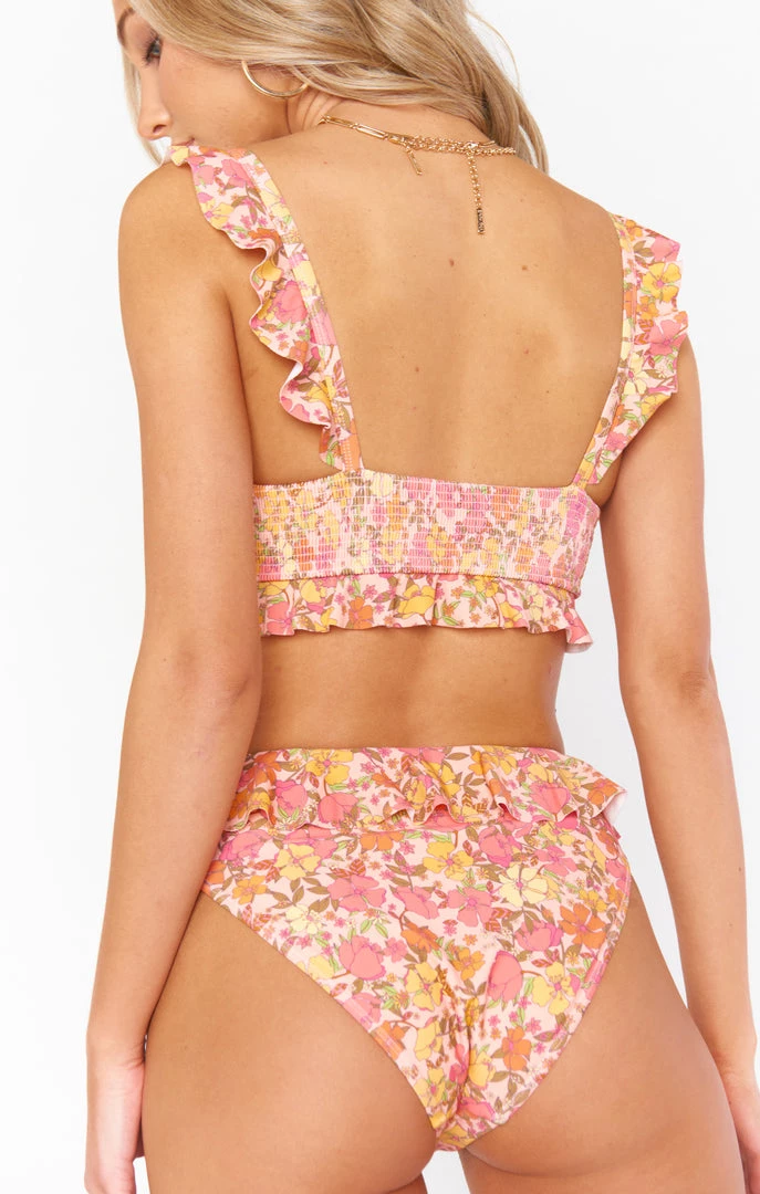 Ruffles on the straps and bottom hem make this little pink floral bikini top as cute as it is chic! The slight sweetheart neckline is super flattering, especially with the smocked back to perfect the fit for a range of bust sizes