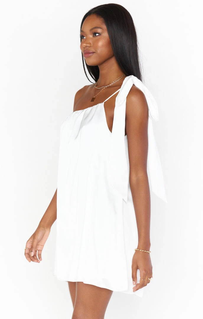 Try out our spin on the trapeze dress with a one shoulder strap, removable waist tie and adorable mini cut. This white Tasha mini is easy to throw on and we added a shelf bra and elastic along the neck to keep you secure all night long. Dress it up with your favorite earrings and colorful heels for your next special occasion!