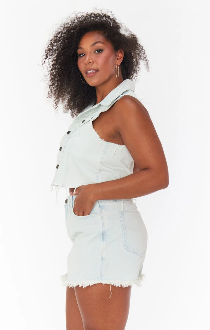 Cool girl meets country, this denim vest is a vintage inspired must! Crop top lovers rejoice, this raw hem allows you to take off a few extra inches if you so choose. Pair with the matching Statesboro Skort to be a denim darling.