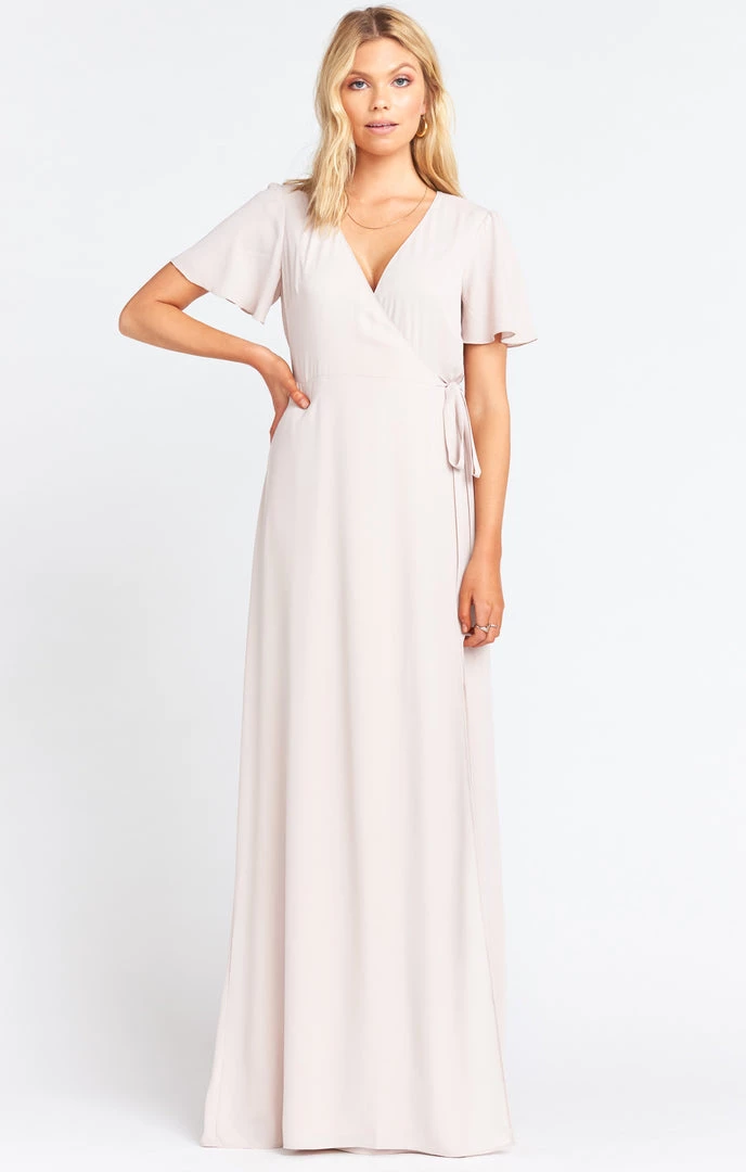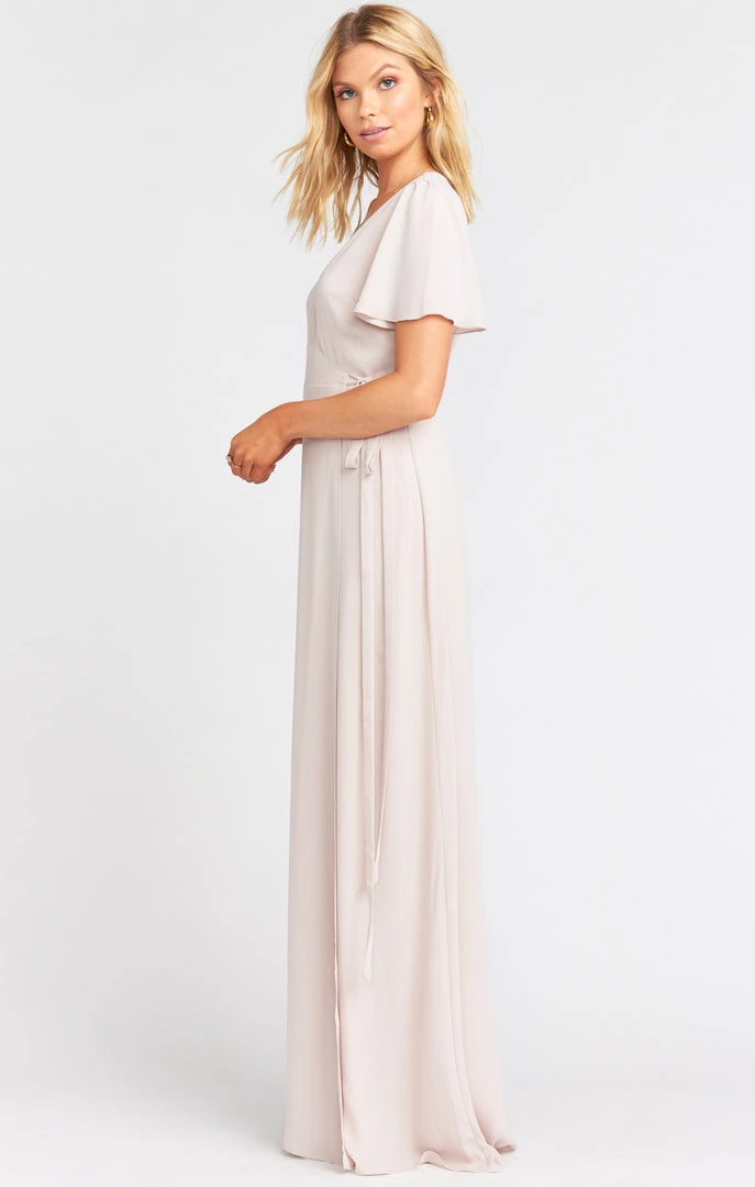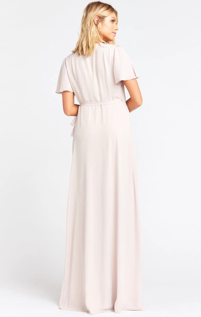 The Noelle Flutter Wrap Dress has all the perks of a maxi with the fit of a wrap dress. Classic V in the front with a filled in back compliments a flutter sleeve and full slit created by the wrap. Ties can be wrapped twice to perfect the cinch at the waist.