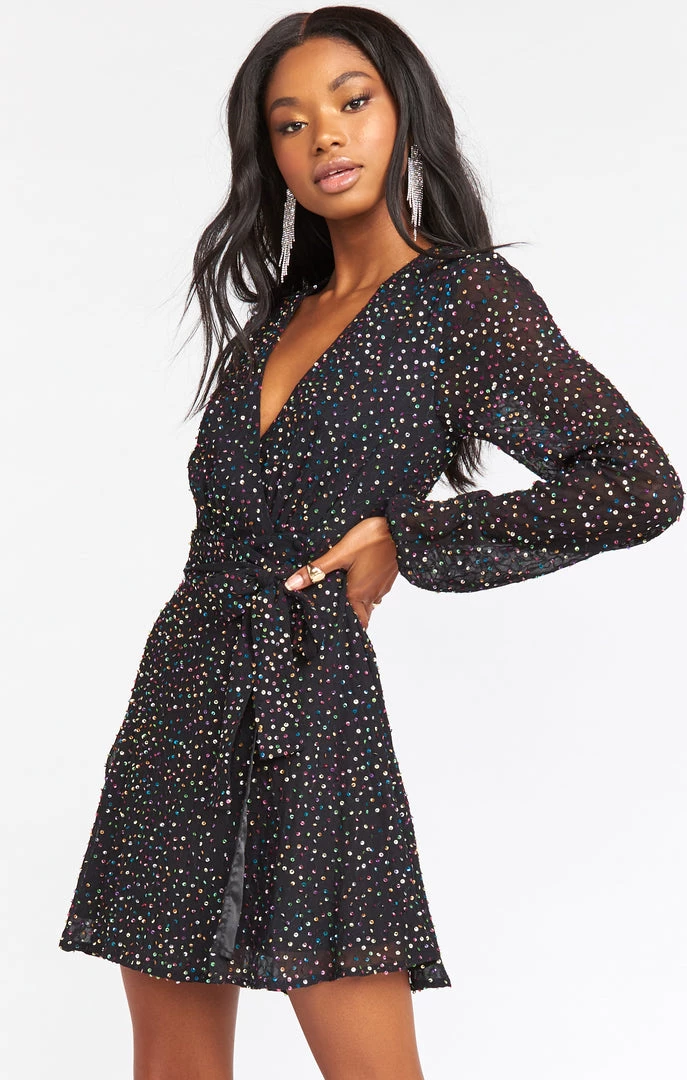 Flowy mini dress embellished with sequins. This mini dress features a double hook and eye clasp in the front, a detachable belt and voluminous sleeves. Pair with your favorite booties or chunky heel and your ready for a GNO!