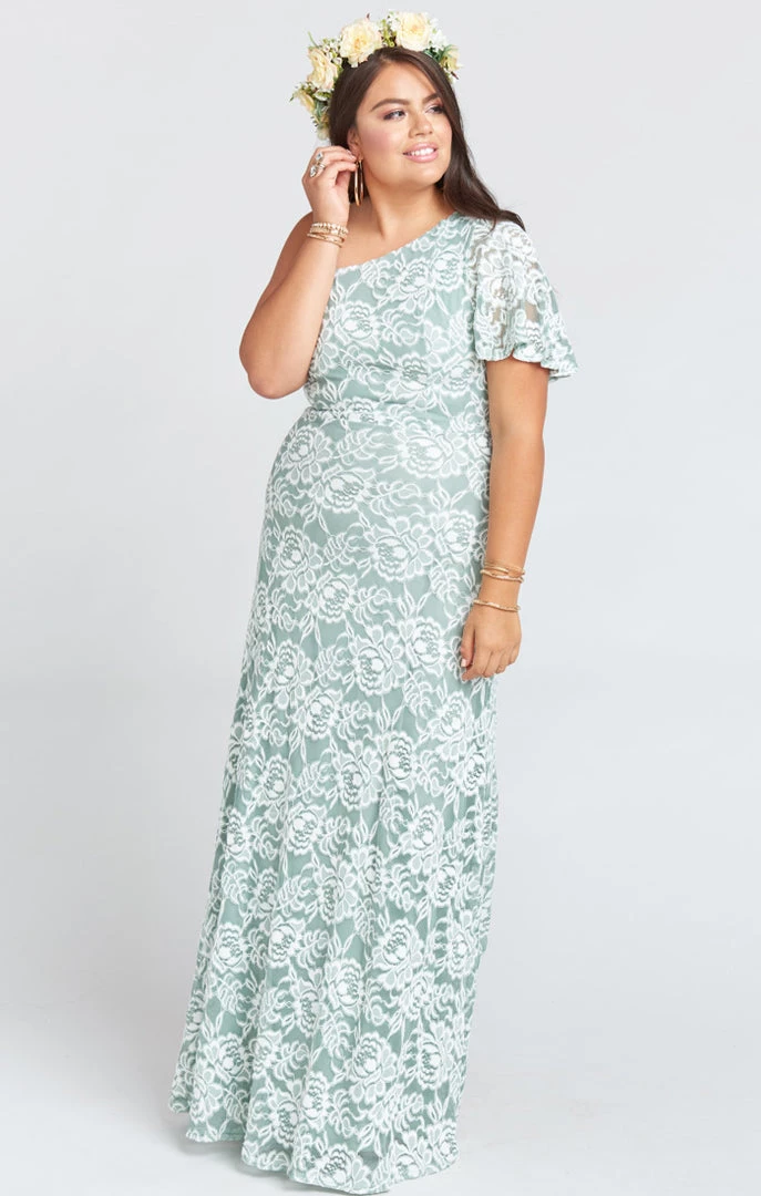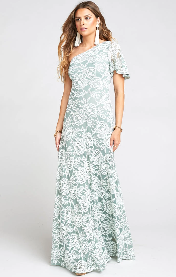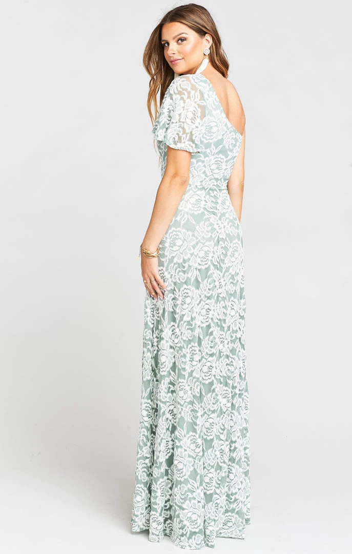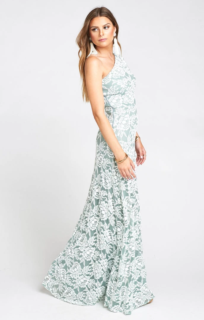 Show Me Your Mumu Portia One Shoulder Maxi Dress ~ Lovers Lace Silver Sage