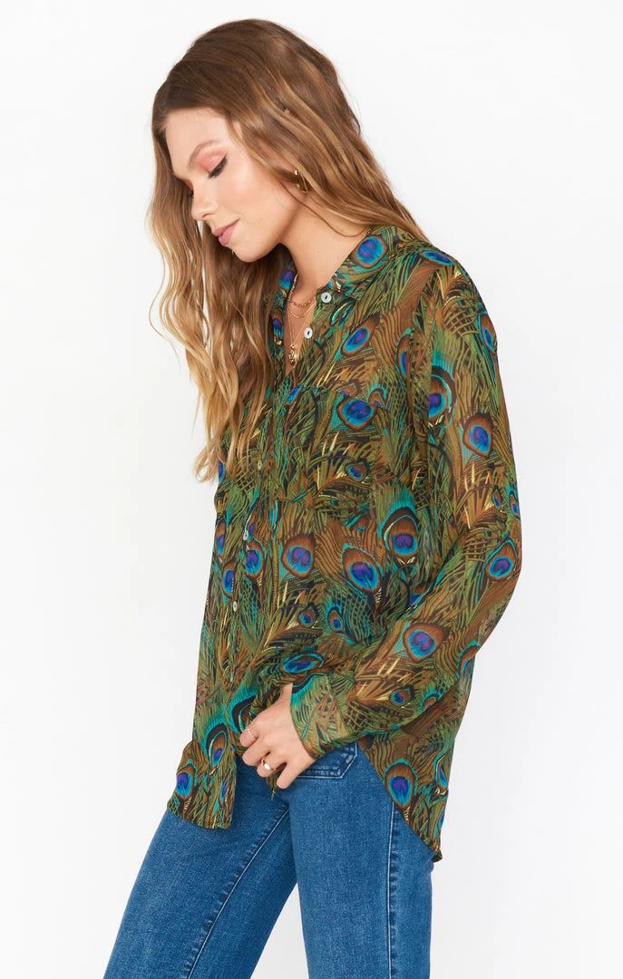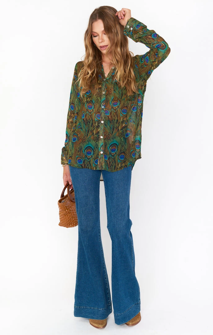 The perfect oversized light weight OG peacock print button down that you will be wearing on repeat. This shirt has a raw hem, button down closure and two pockets at the bust line. Tuck into your high waisted go-tos or tie up with some denim.