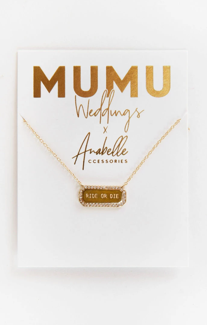 We collaborated with Anabelle Accessories to create a collection of custom necklaces. Each piece is handmade in California & is exclusive to Mumu just for you! The Ride or Die necklace is intended to be worn by your besties on your bachelorette trip and your big day!
