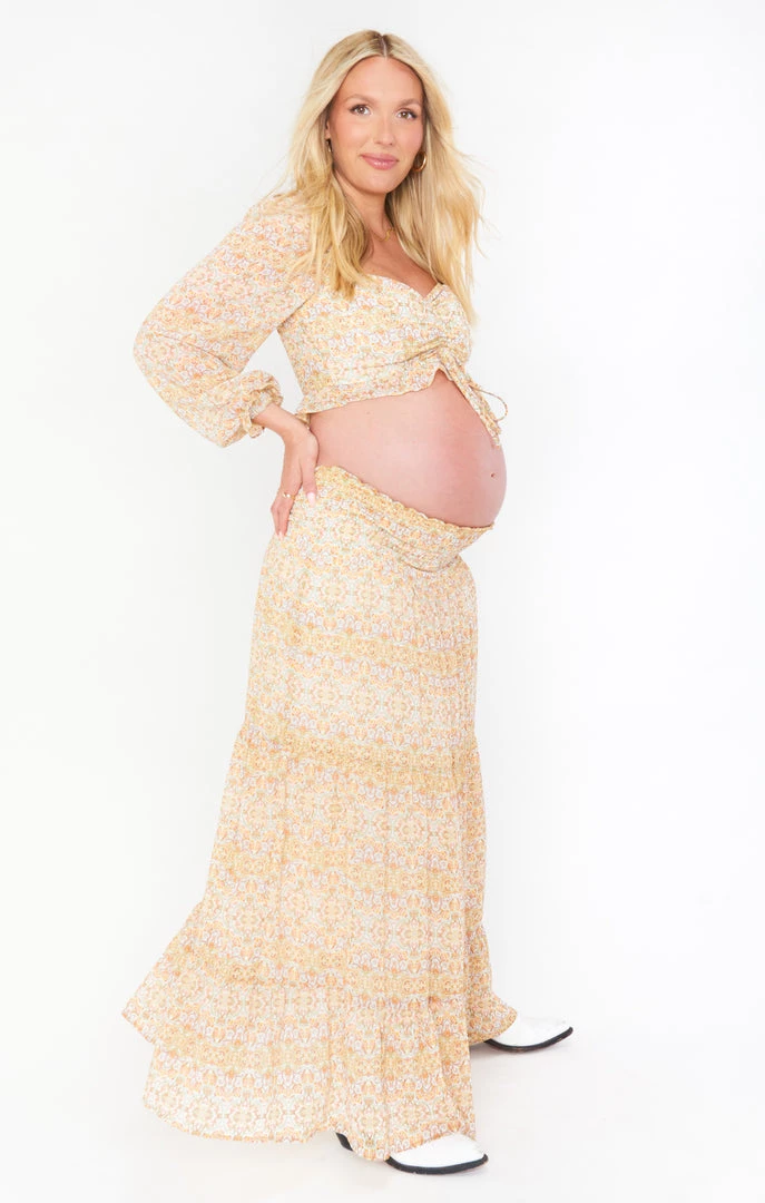Get ready for your new favorite crop top! This flattering blouse comes in a netural paisley print with a form fitting smocked back. The center ties can be cinched for a flattering crop and the blouson sleeves with a ruffle hem creates the perfect chic look. Pair with jeans for an everyday look or matching Sadie Skirt for a chic brunch!