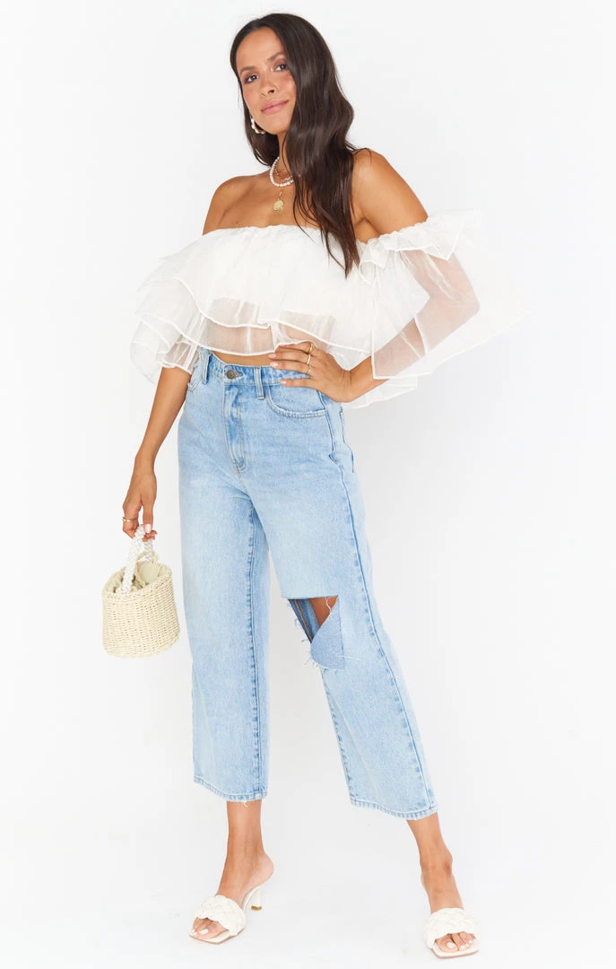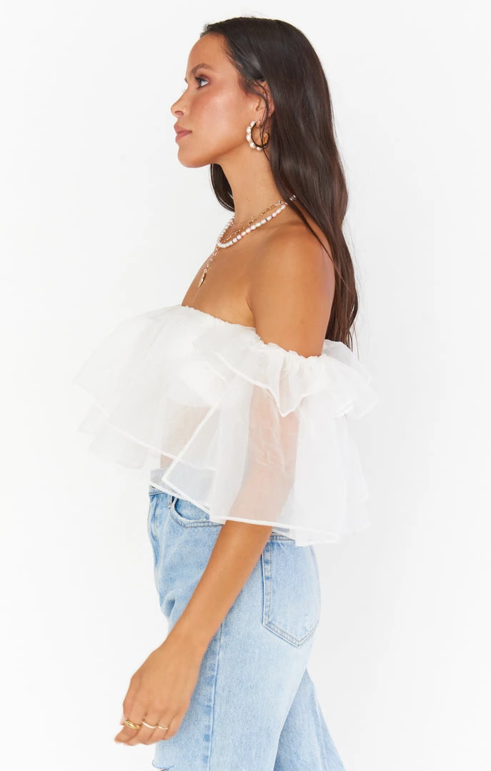 Angel in organza wearing this off the shoulder white top! Ruffled to perfection with elastic around the neckline to keep it in place, this feminine white crop top will bring every outfit to the next level. Bride to be, look no further for the perfect white accent to your shower, bach or rehearsal dinner outfit!