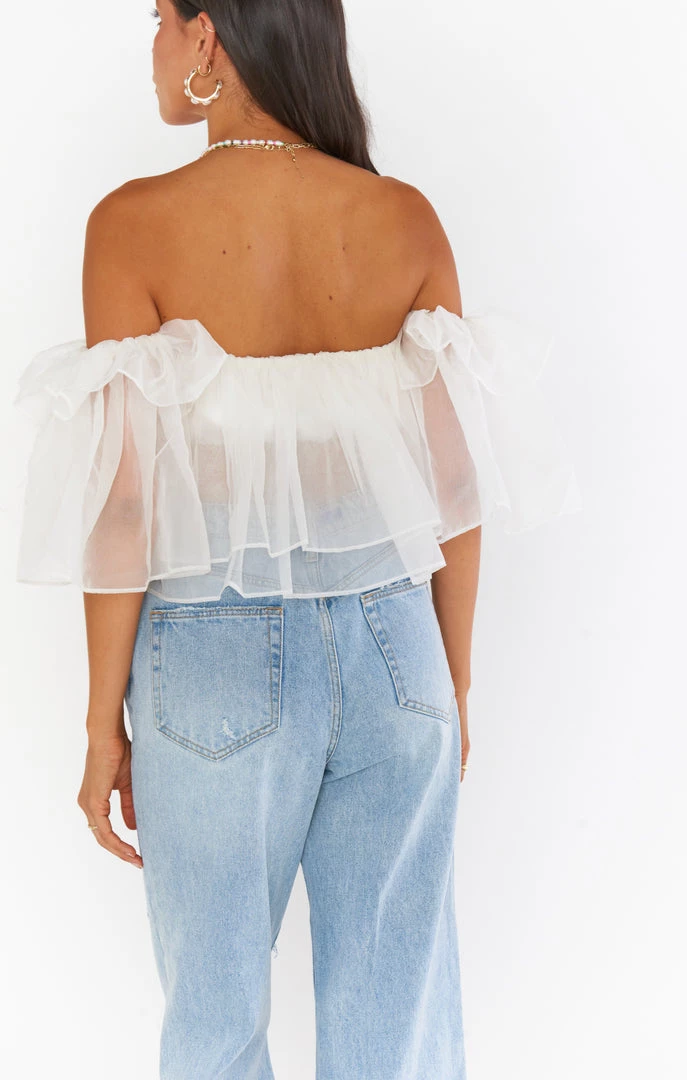 SKU: show-me-your-mumu-6747519287339 Categories: Blouses, Clothes, Crop Tops, New Mu, Tops, Tops Tags: Child:White Organza, Parent:rossella-ruffle-top, Sleeve:convertible, Sleeve:ruffle, Sleeve:short sleeve, Sleeve:strapless, Type:tops, YGroup_rossella-ruffle-top