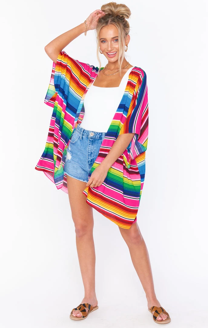 The little wrap that every OG MUMU gal needs in their closet. The Ryry Wrap lends the perfect pop of color in are throwback Serape Party print that we all know and love. She has a flowy short sleeve to keep you cool and a detachable belt that gives you the option to wrap her up or wear her open. Throw her over your fave bikini for you next beach day, or wear her out on the town with your fave denim shorts and tee, with the Ryry the options are endless!