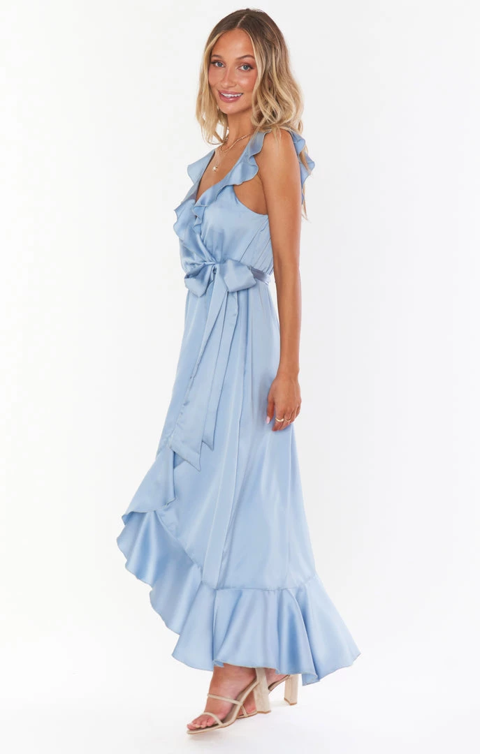 Show Me Your Mumu Samantha Ruffle Wrap Dress ~ Steel Blue Luxe Satin Bridesmaids Dresses
