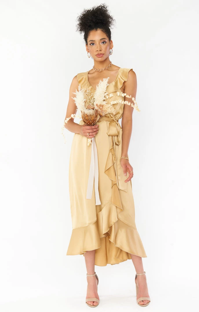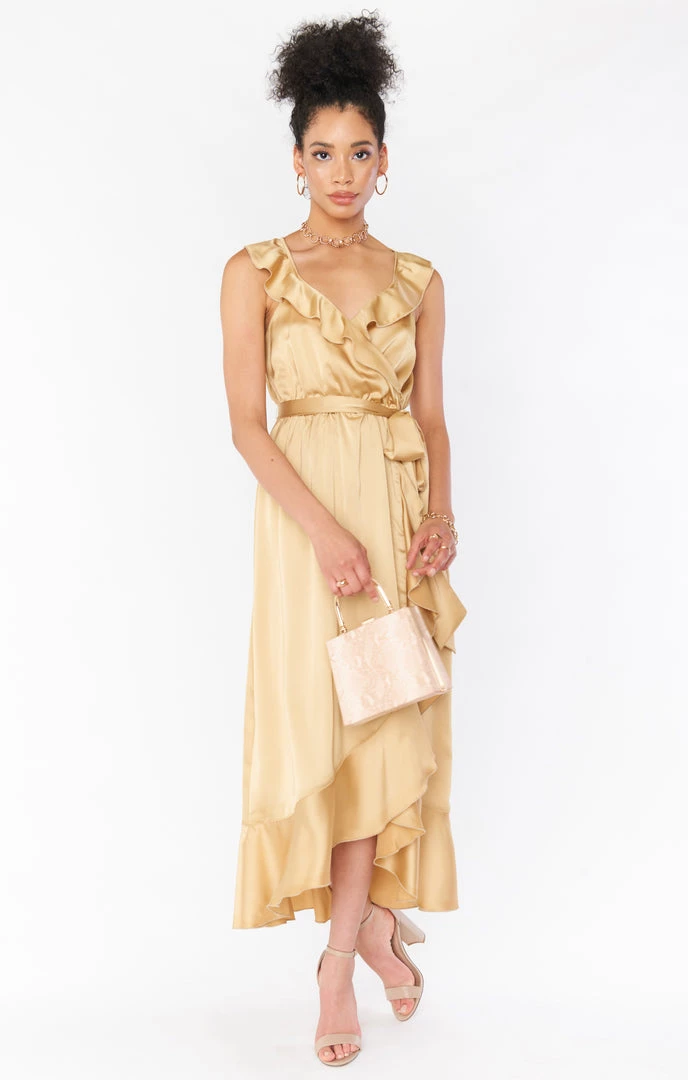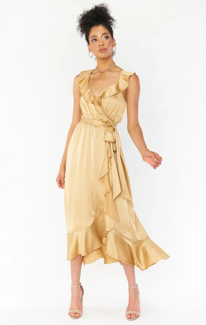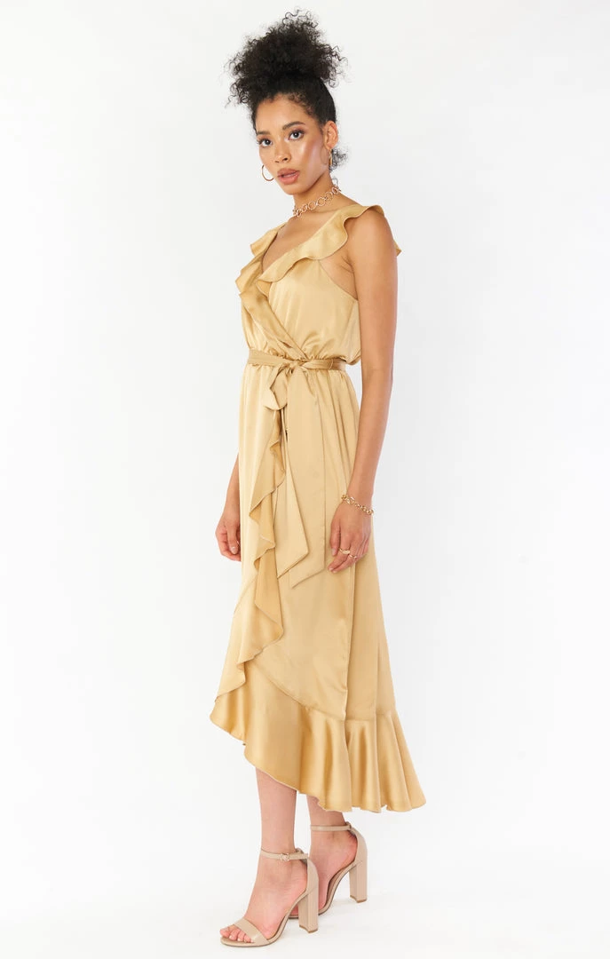 Show Me Your Mumu Samantha Ruffle Wrap Dress ~ True Gold Luxe Satin Dresses