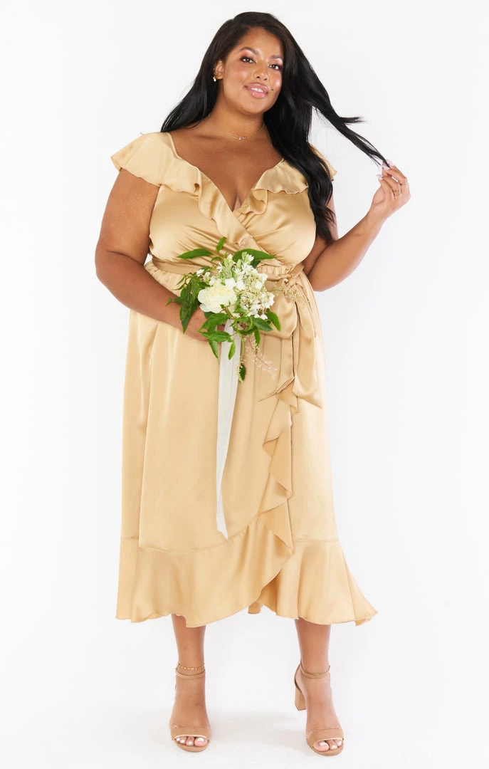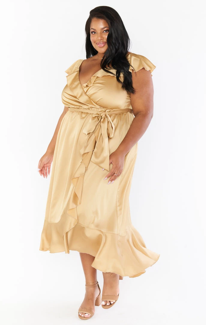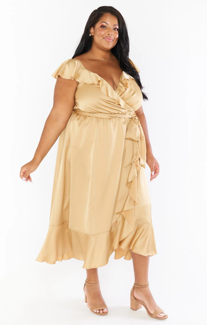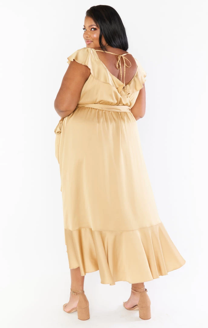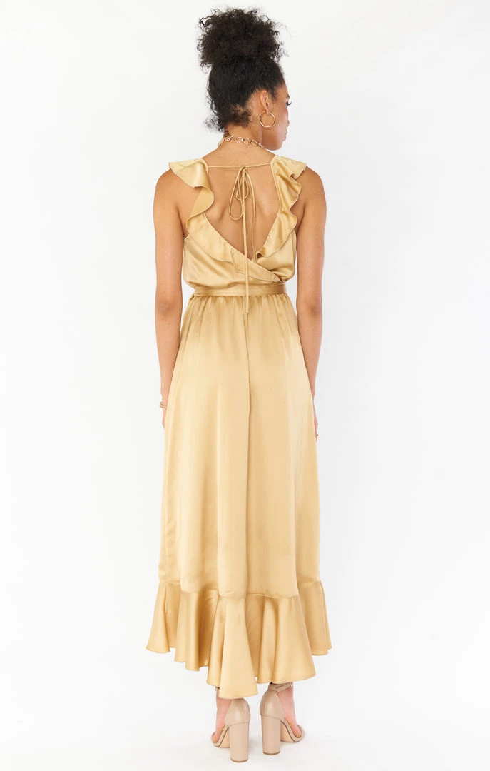 Show Me Your Mumu Samantha Ruffle Wrap Dress ~ True Gold Luxe Satin Dresses