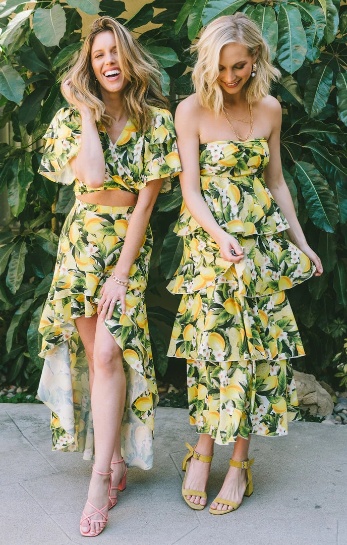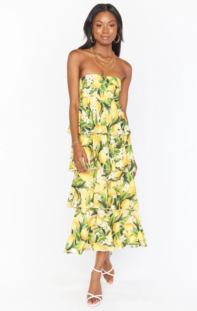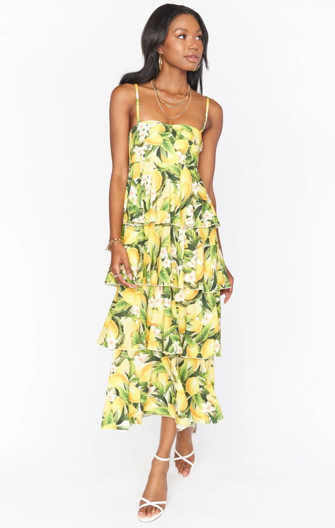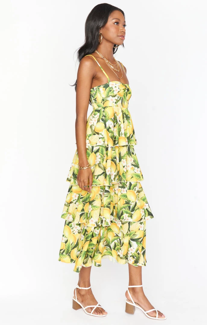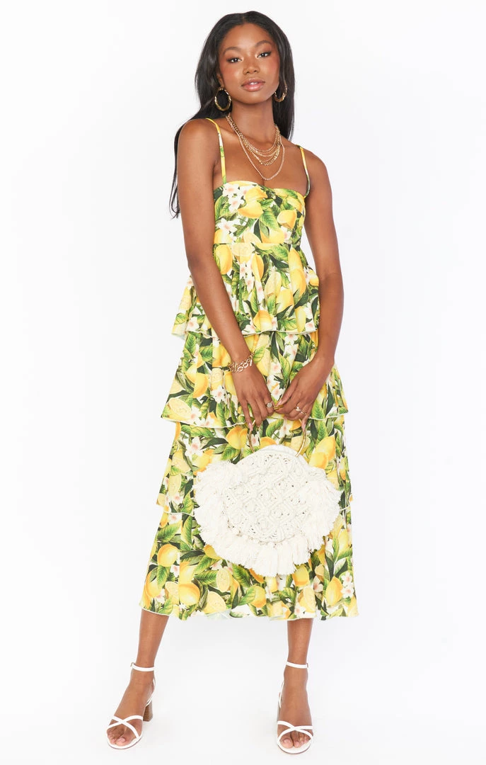 The Savannah is a fun and flirty tiered ruffle maxi dress, she has slightly gathered and flattering empire waistline. She is easy to throw on with her smocked back and adjustable straps that can also be removed for a strapless style. Her bright and bold citrus print will make you want wear her all summer long!