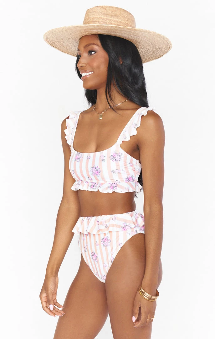 Ruffles on the straps and bottom hem make this little pink and white striped bikini top as cute as it is chic! The slight sweetheart neckline is super flattering, especially with the smocked back to perfect the fit for a range of bust sizes!