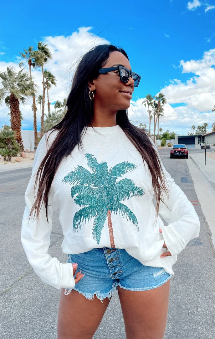The oversized Simon is the perfect pullover to rock all year long, she has a relaxed scoop neck, a crisp white with a perfect palm graphic and is great for layering! Pair this easy-fitting pullover with your fave MUMU cut offs and Lack of Color hat for a cute weekend fit.