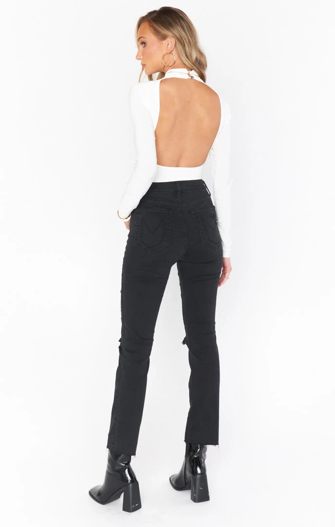 The literal perfect black skinny jean with a zip and button fly. You’d never know by just looking but this denim is super stretchy giving them a structured look but are incredibly comfortable.