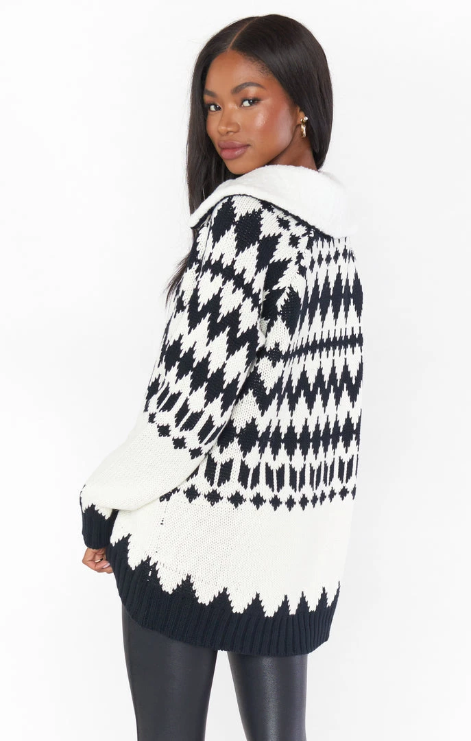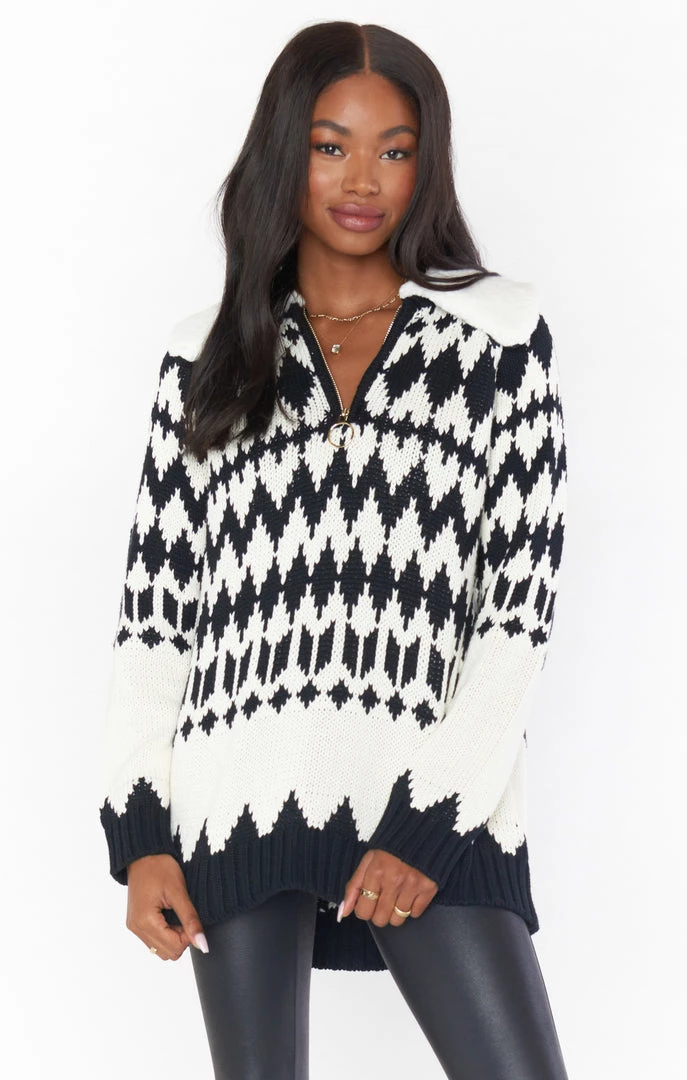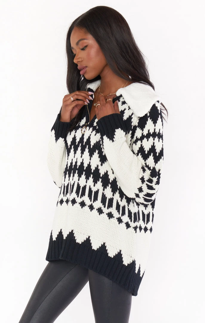 Get ready for your next ski mountain adventure in this black and white pullover! Created for warmth and style we paired an o-ring half zip, faux sherpa collar and a chic geo knit pattern for the perfect winter sweater!