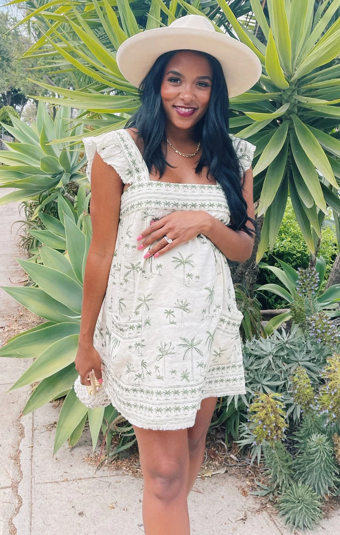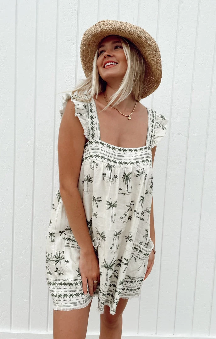 Suns out and minis are in! You will be wearing this palm linen mini dress on repeat. Square neck gives coverage, while the dainty ruffle sleeves give a touch of fun.