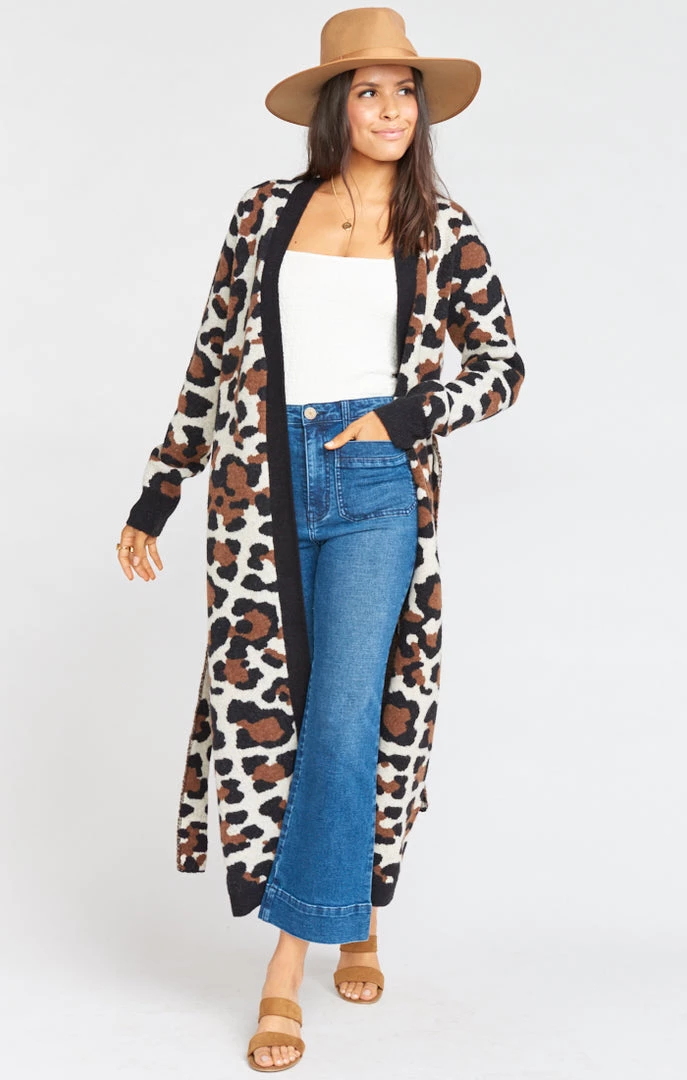 Cozy and sassy cheetah knit cardigan. This cardigan features a long fit and a wrap around belt. Pair this cardigan with you fave MuMu bells or skinnies and a basic tee and you’ll have the sassiest and coziest outfit around town!