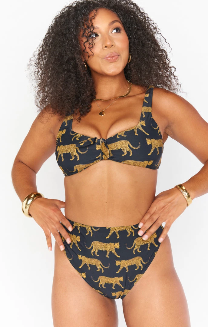 The Daytona is a bralette-style bikini top with supportive thick straps, her tie in the front is removable and can double as a matching hair tie, and transform this top into a totally different style! Pair with her matching Palma Bottoms in Black Catwalk to complete your beach day bikini look