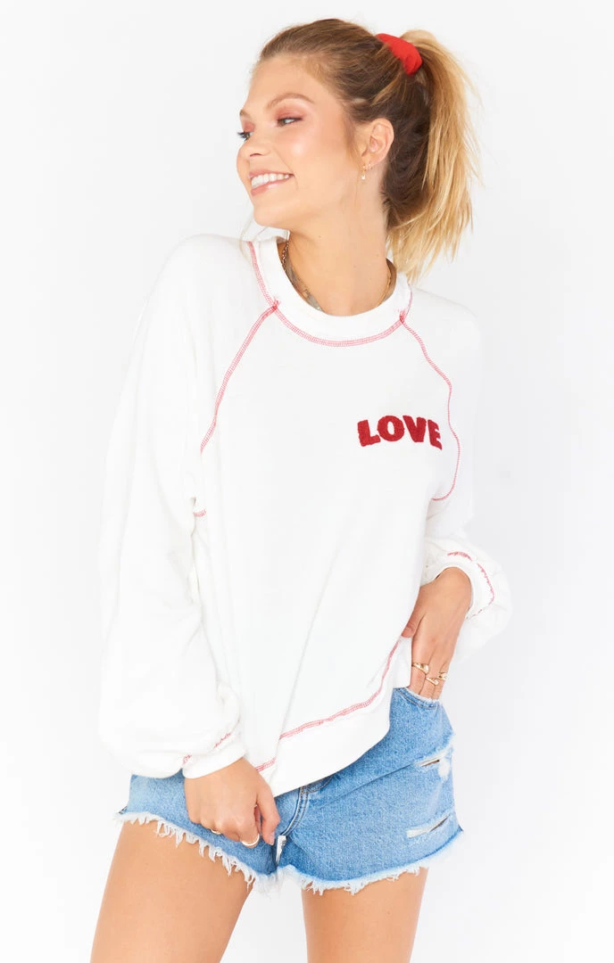 Get in the mood for LOVE in our swipe left sweatshirt. We added adorable bubble sleeves, red contrast stitching, and plush lettering for a sweatshirt that is anything but ordinary. Pair with the swipe right sweatpants for a monochromatic look that will have you swooning!