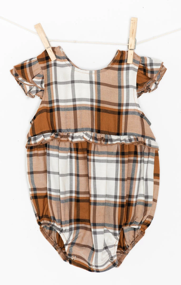 Ruffled cap sleeves and a sweet little ruffle around the center make this little plaid bubble romper so cute it hurts! Snaps at the neck and bottom to help get in and out easily!