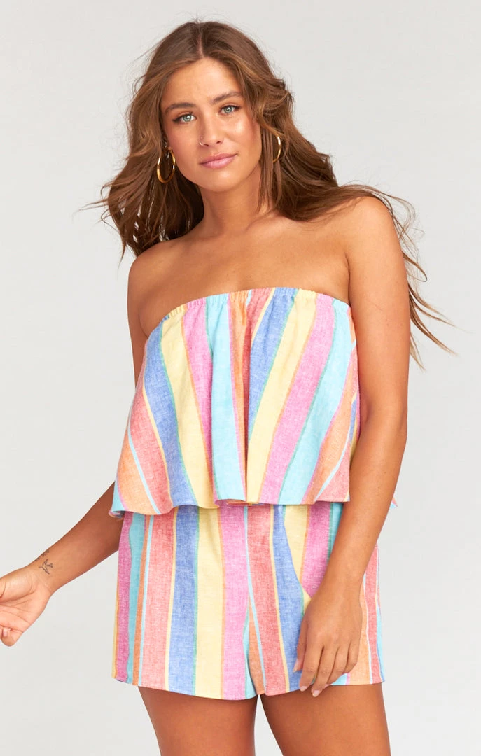 Show Me Your Mumu Thelma Romper ~ Rainbow Stripe Linen Rompers