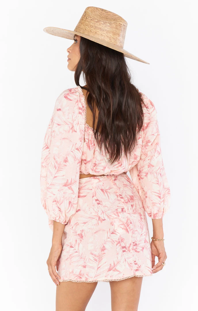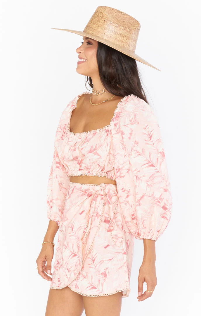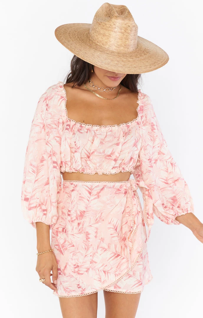 Our chicest crop top yet with voluminous sleeves and adorable crochet trim. It fits perfectly to your body with elastic cinching you in at the waist, chest, shoulders and wrist. Pair the Claudia Crop Top with your favorite pair of high waisted jeans or our Iva Wrap Skirt for a matching Pink Majestic Palm outfit!