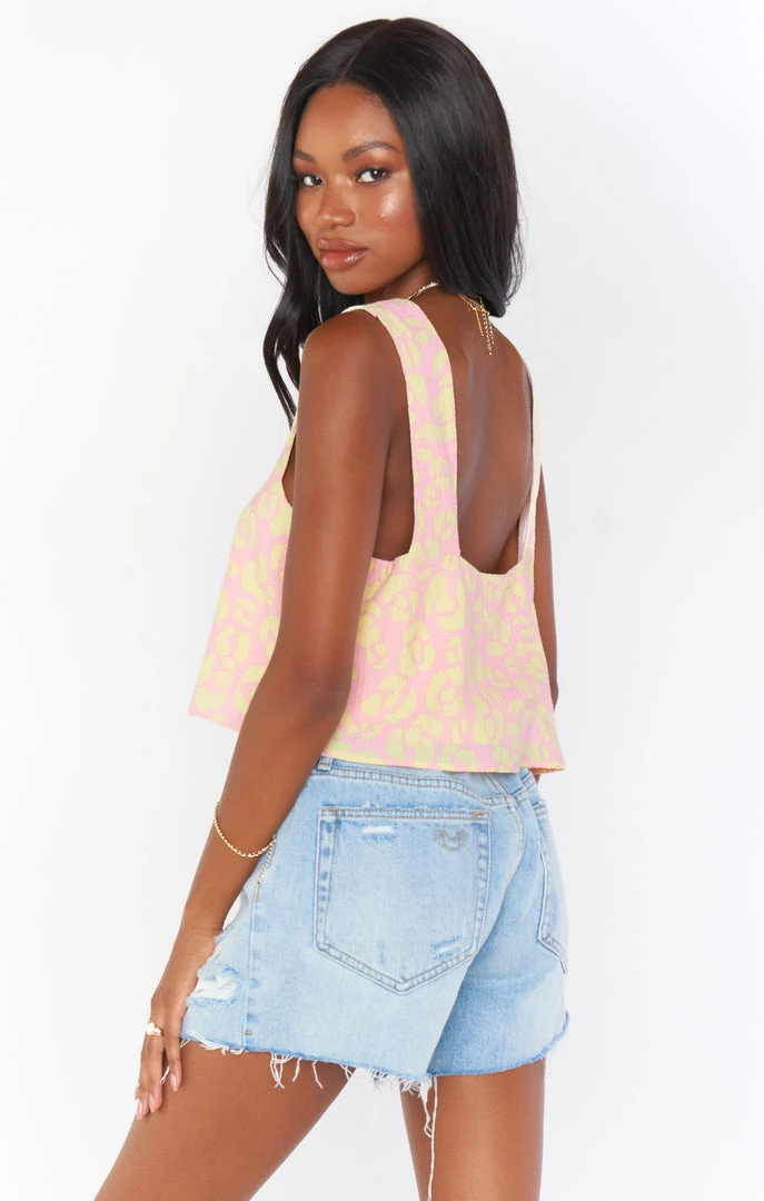 Simple but never boring! With a square neck and thick straps, this pink and yellow cheetah crop top is bra friendly and perfect to pair with your favorite Mumu denim or matching shorts.