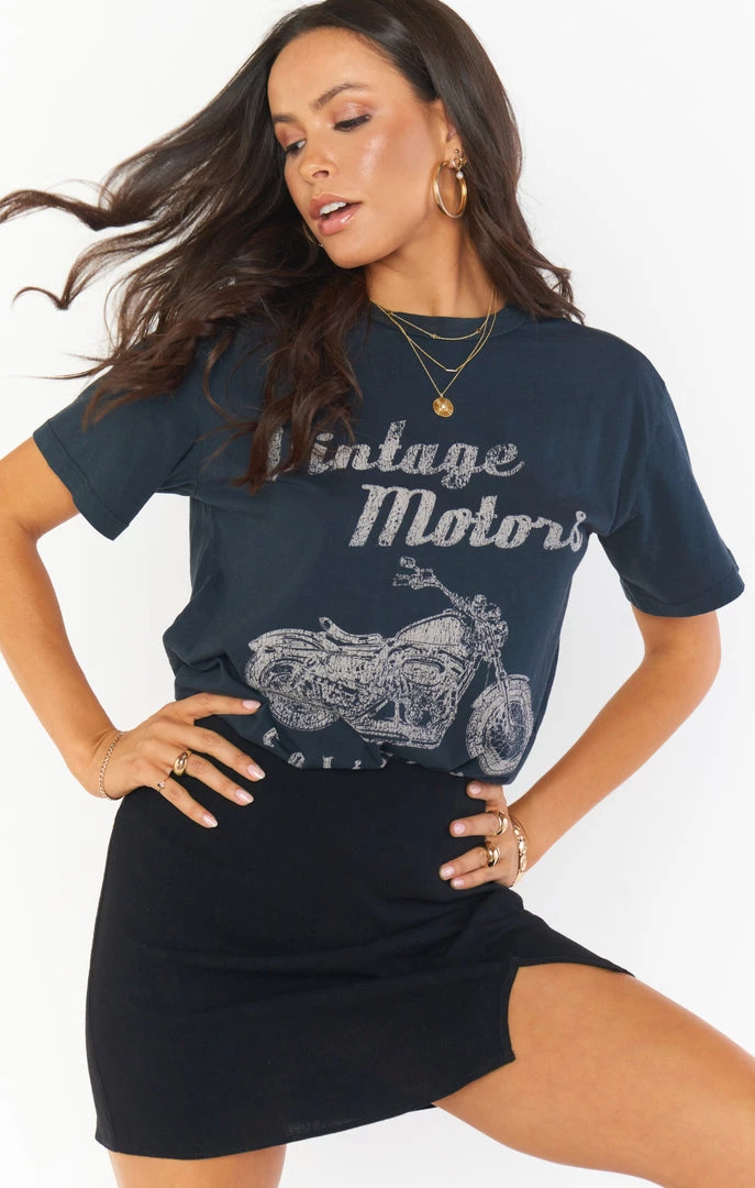 This black linen skirt may be mini, but it’s big in style! Zipper closure and slit make this not your everyday mini skirt. Dress it up with a black bodysuit or cool it down with the Travis Tee in Cali Motors Graphic.