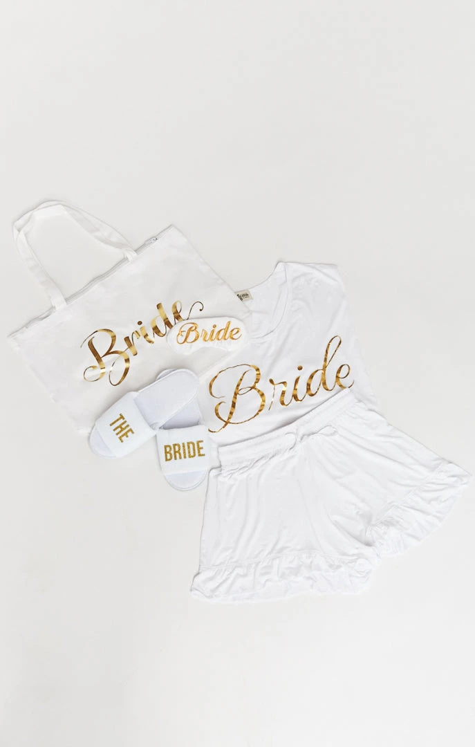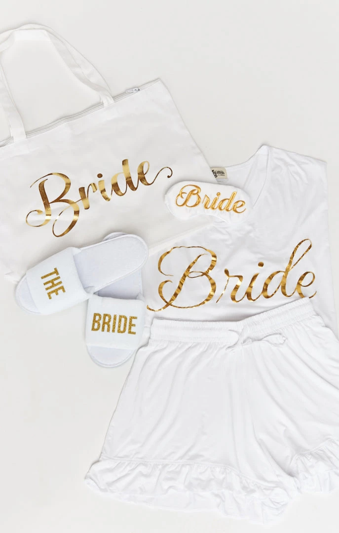 Our ultimate Bridal pack is stuffed full of our favorite bridal accessories in a gorge tote bag that you can use over and over!! You Receive: *Benji Tunic Sleep Set ~ Bride Graphic – Select your PJ size *Bride Eye Mask *The Bride Slippers *Bride Zipper Tote Bag