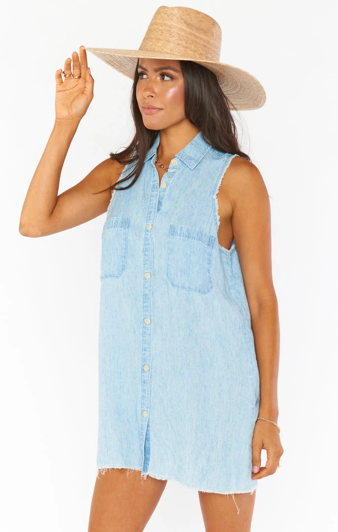 The Vicki is an easy chambray shirt dress with a button up front, collared neckline, and raw hemline.