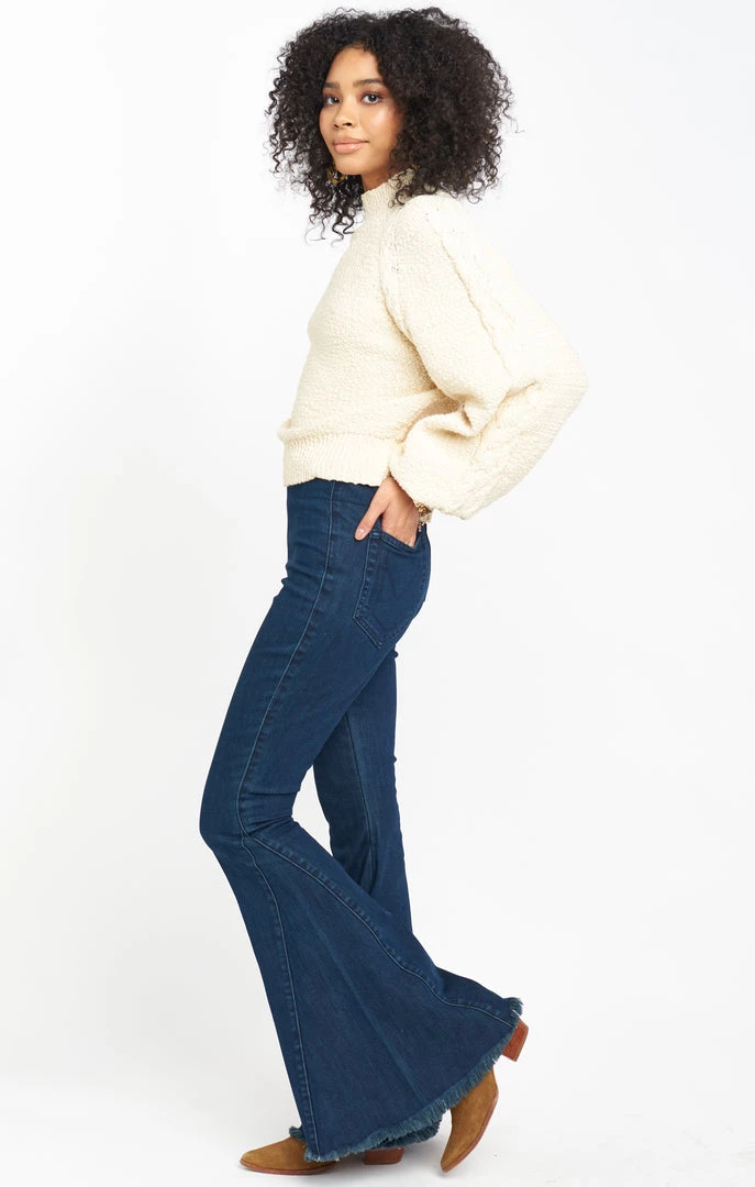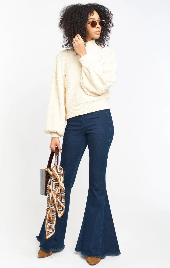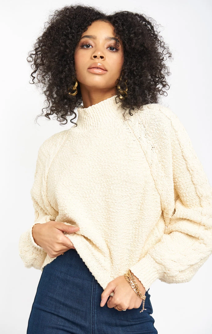 Everyone needs a good cable knit sweater in their closet, so we created one! Made with our favorite cozy slub knit, bishop sleeves, and a ribbed mock turtleneck you will love the vintage look of this amazing sweater.