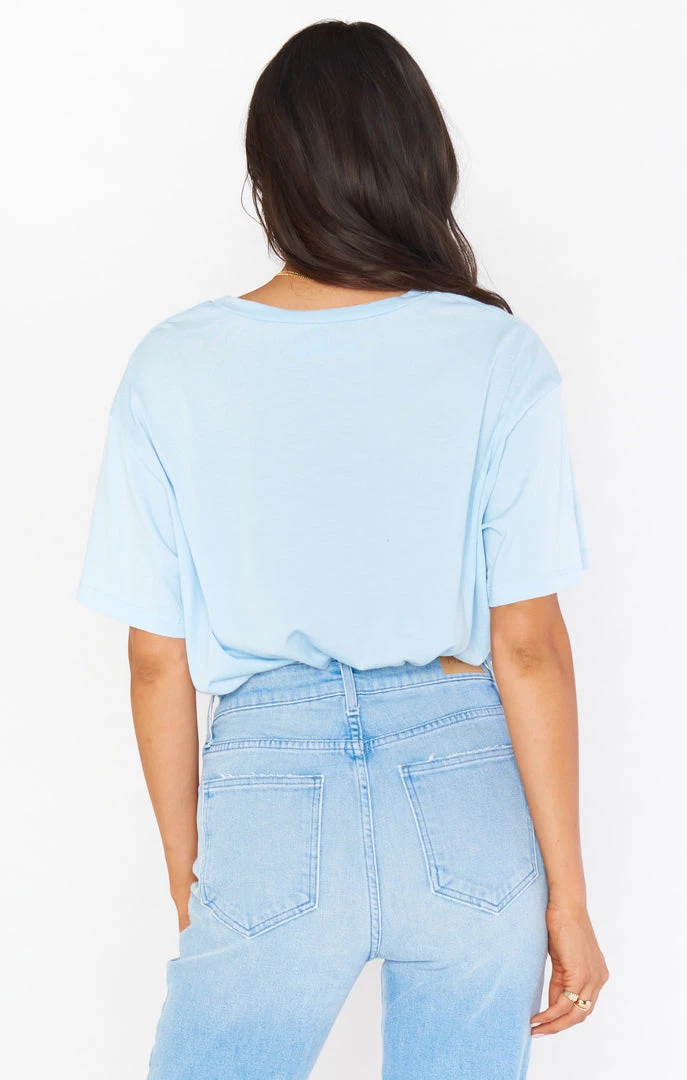 Vintage ski bunny vibes in this light blue graphic tee shirt. Scoop neck and shortleeve with the perfectly oversized fit, you will reach for this time and time again. Whether its Colorado or couch, you will be comfy and cozy.
