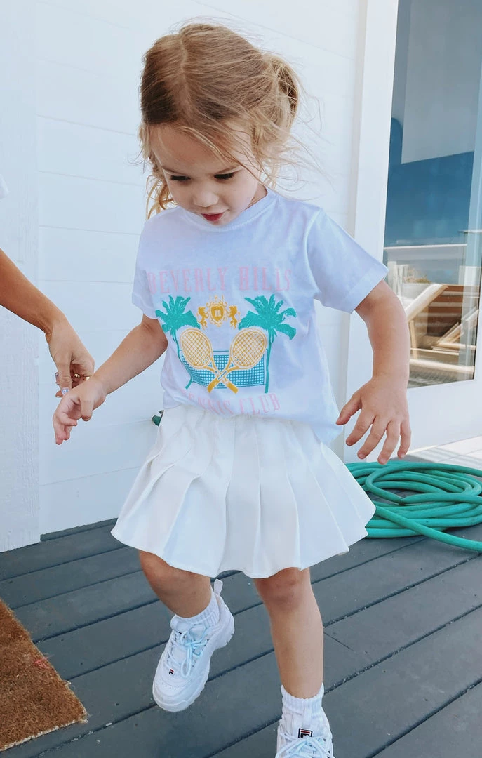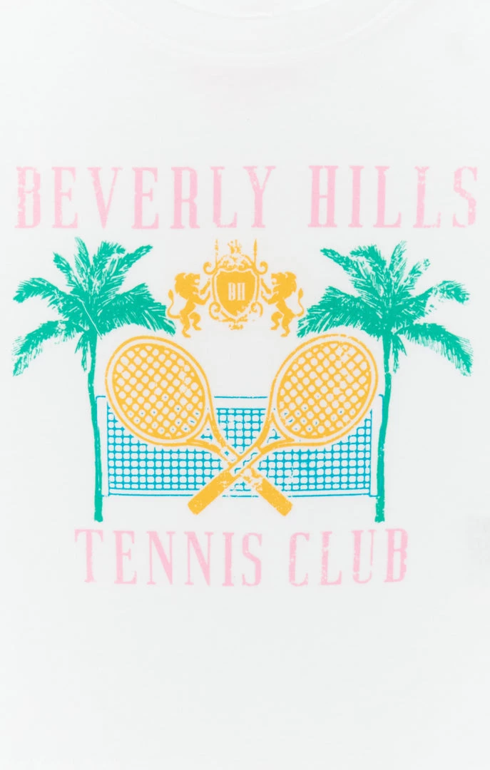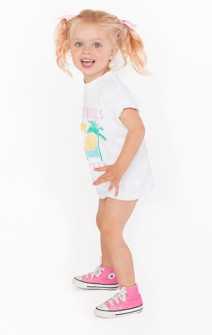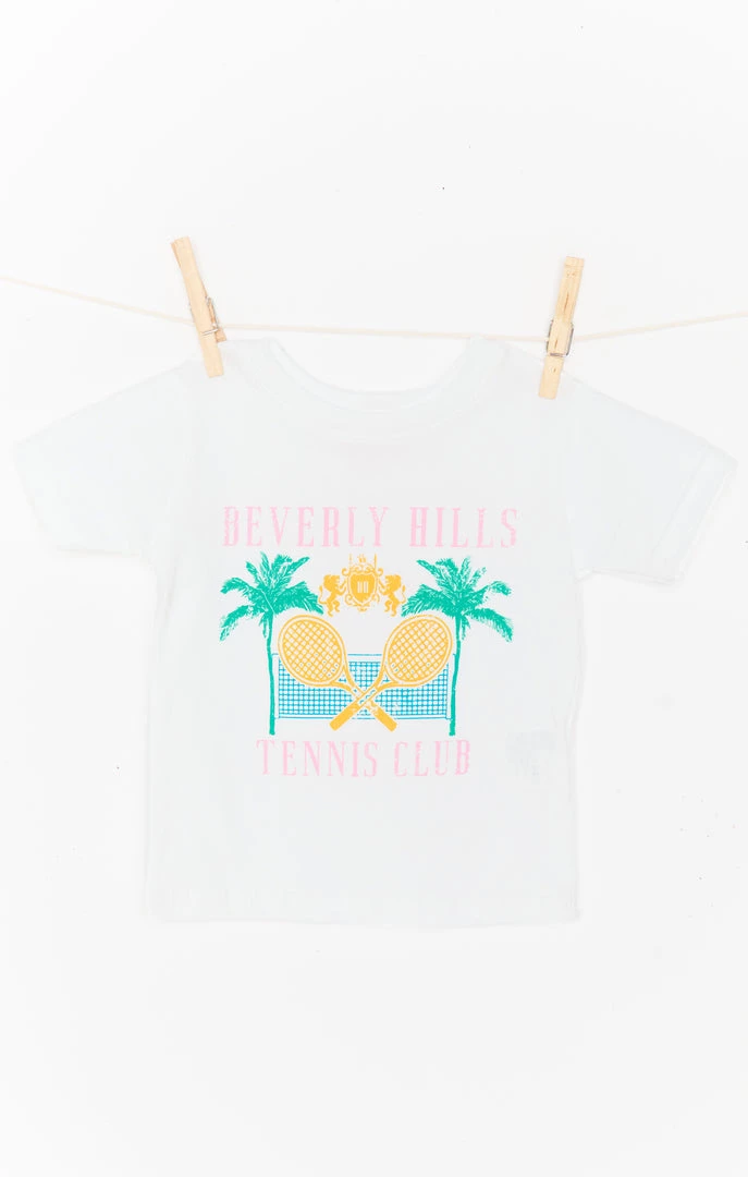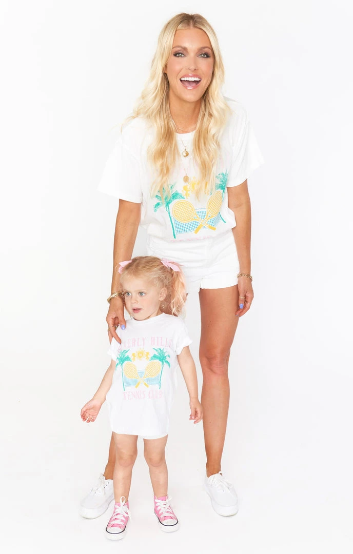 The perfect tee for your little one! The Wolfie Tee has a scoop neck and “Beverly Hill’s Tennis Club” graphic. Pair this tee with the adult matching Airport Tee and your match your mama game will be love-love every time!