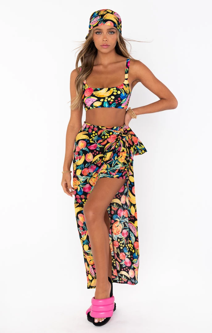 Slip into this easy fruit maxi skirt and take your outfit to the next level. With a mini slip and high to low outer layer this skirt shows a little skin while still being cute and classy. Pair with a chic bodysuit or matching swim!
