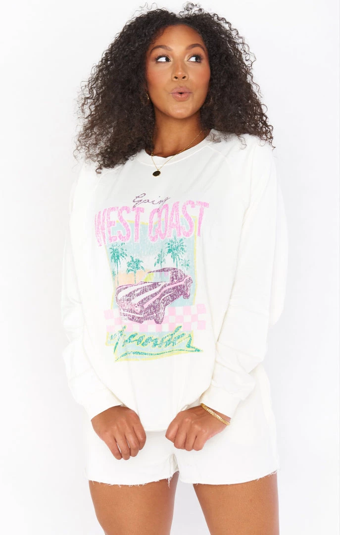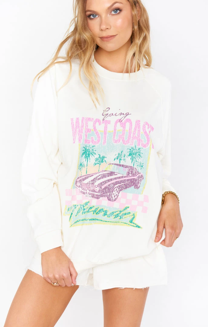 This off white sweat set is our best yet! A classic vintage inspired West Coast graphic on the top has a perfectly slouchy fit on top of super comfy elastic waist shorts.